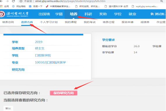 (1)选择培养方案研究方向:学生需要先选择研究方向,才能进入后续的个人学习计划制定的工作。流程:点击培养---选择方向---选择研究方向(此处研究方向的选择主要作用是针对开设课程,不会影响实际科研研究方向,因此大部分专业此处方向为默认,选择“默认”)---保存研究方向,如下图: