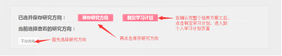 (1)选择培养方案研究方向:学生需要先选择研究方向,才能进入后续的个人学习计划制定的工作。流程:培养-选择方向-选择研究方向-保存研究方向-制定学习计划