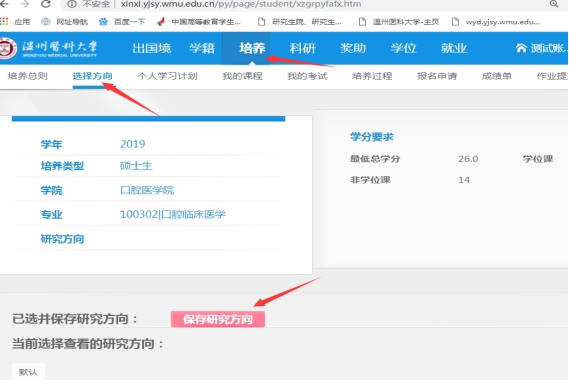(1)选择培养方案研究方向:学生需要先选择研究方向,才能进入后续的个人学习计划制定的工作。流程:点击培养---选择方向---选择研究方向(此处研究方向的选择与开设课程关联,不会影响实际科研研究方向,大部分专业此处方向为默认,选择“默认”,但内科、外科、药学等专业方向必须明确)---保存研究方向,如下图: