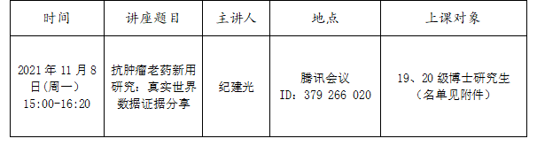 因疫情影响,原定于11月8日(周一)下午在欧美色情片 附一院学术报告厅举行的《医学科研设计与方法》课程改为线上课程,请参加课程的同学提前十五分钟输入会议ID进入腾讯会议,具体安排如下: