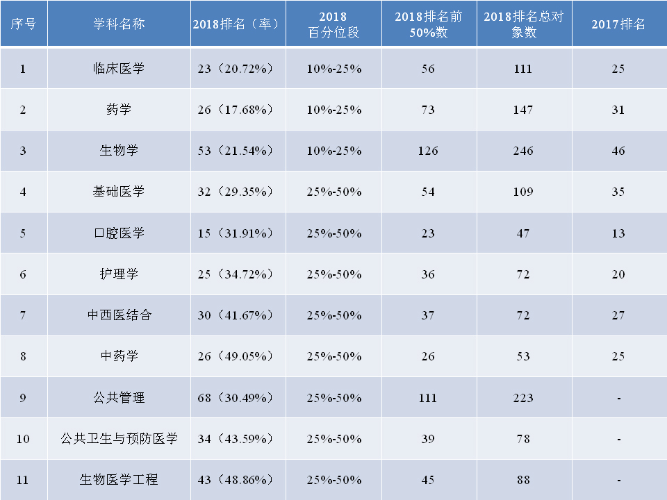 11月1日,上海软科正式发布2018“中国最好学科排名”。欧美色情片临床医学、药学、生物学、基础医学、口腔医学、护理学、中西医结合、中药学、生物医学工程、公共卫生与预防医学、公共管理等11个学科上榜,上榜学科数较上一年度增加3个,临床医学、药学和基础医学等学科排名均有明显提升。