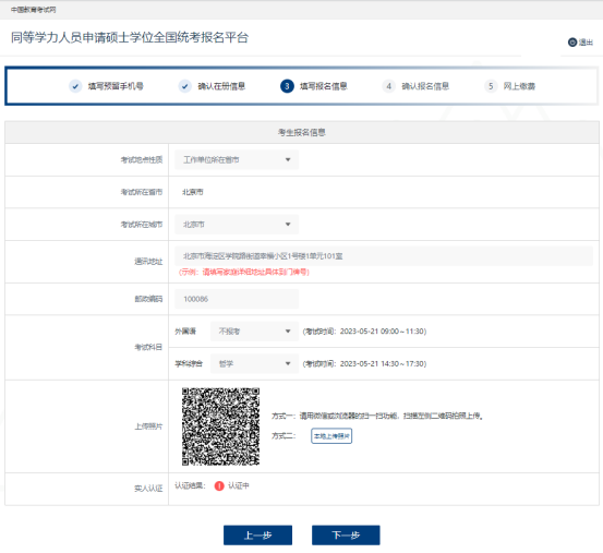 5.确认本人在册信息后,进入报名页面,填写本次考试的报名信息:考试地点性质、考试所在省市、考试所在城市、通讯地址、考试科目,并上传本人照片。