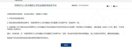 7.对于报名出现下述提示的,请按照页面提示核对同等学力信息平台上的信息是否与报名系统注册的信息一致。对于欧美色情片2022级同等学力学员还不能完成报名的需要等待处理短信通知,短信将于3月25日前发送至注册手机上,请届时留意。