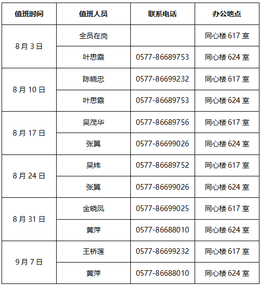 值班安排详见下表: